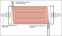 L'illustration 159 montre un exemple pour la construction des raccords à contre-courant et le montage de la tuyauterie en cuivre à l'intérieur du tuyau d'arrosage. Les pièces sont en 12mm standard, en cuivre rigide, un embout et un raccord en T. Les pièces sont soudées ensemble en utilisant de la soudure à l'argent sans plomb et un chalumeau au propane. Les extrémités du tuyau d'arrosage sont coupées et maintenues en place par les colliers de serrage sur le T. Le tube de cuivre diamètre 10mm où circule le moût sort à travers le capuchon d'extrémité par un trou de diamètre 12mm. L'ouverture pour le tube est scellée par un cordon de soudure autour du trou.