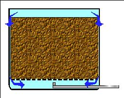 En maintenant le gâteau de drêches sous une couverture d’au moins quelques centimètres de liquide, il reste dans un état fluide et non sujet au compactage par gravité. Chaque particule de grain est libre de mouvement et le liquide peut l’envelopper complètement. Si le gâteau n’est pas maintenu dans un état fluide, cela conduit à des chemins d’écoulements préférentiels (l’une des causes principales de faible extraction) et peut même aboutir à un colmatage.
