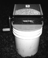 • Le moulin Corona utilise deux disques tournant en sens contraire pour moudre le malt. Il produit facilement une farine finement moulue et râpe les enveloppes des grains, ce qui nuit à la filtration. Régler le moulin pour obtenir une mouture fine conduit souvent à l’obtention d’une pâte collante. Ce type de moulin peut produire un bon concassage si l’écartement entre les disques est correctement réglé (entre 0,8 et 1 mm). C’est le moins cher des types de moulin, habituellement vendu aux environs de 40 €.