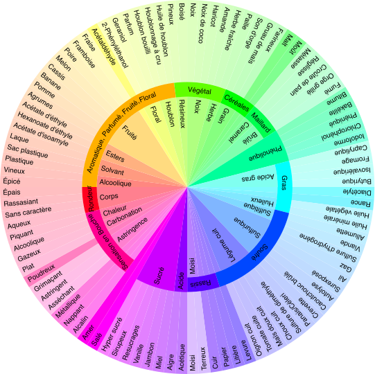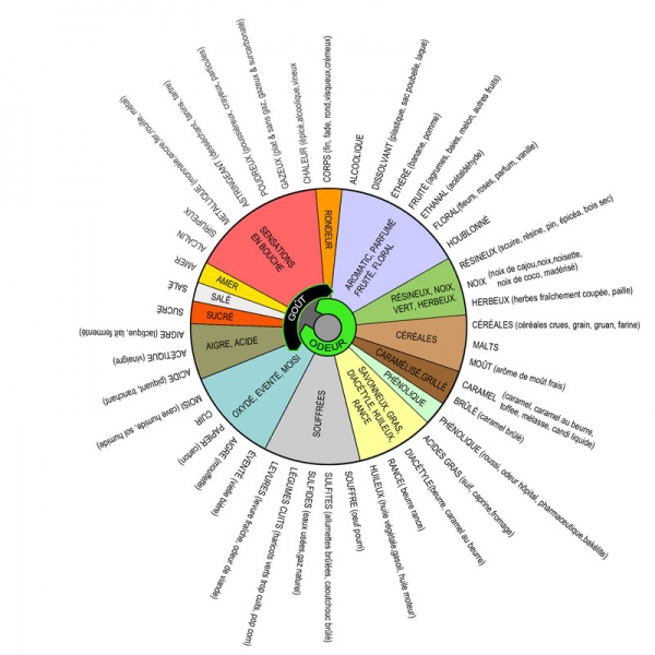 Cette roue est divisée en 13 principales catégories, chacune regroupant un certain nombre de descripteurs plus spécifiques. Cette liste peut être utile pour la dégustation de bières pour faire travailler votre mémoire dans l'identification des éléments subtils des arômes et goûts de la bière.