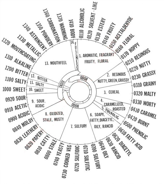 Ci-après une description textuelle de la "Roue des saveurs de la bière", tentative de lister les principaux goûts, odeurs et descripteurs de sensations perçues dans la bière d'une manière organisée, autour de la circonférence d'un cercle, d'une roue, avec les descripteurs les plus proches placés les uns à côté des autres autour de cette roue. Pour les besoins de ce résumé, imaginez simplement la liste suivante de descripteurs comme placés autour d'un cercle, commençant à midi et tournant autour du cercle dans le sens des aiguilles d'une montre avant de remonter vers le point de départ pour finir.